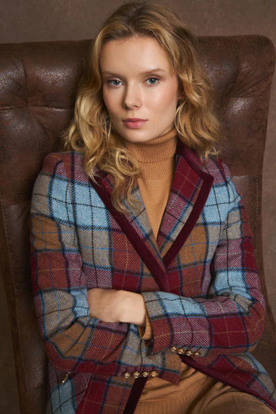 Slim-fit checked blazer. Notched lapel collar with velvet trim. Front closure with contrasting piping and two metal buttons. Front patch pockets with hidden zipper pockets. Long sleeves with a mock button closure and a slight slit. Slightly rounded hem with no vents.