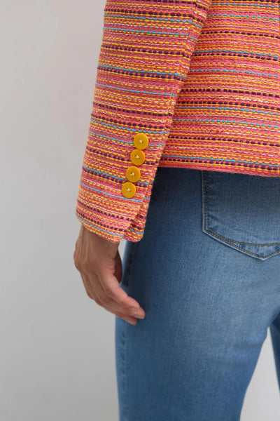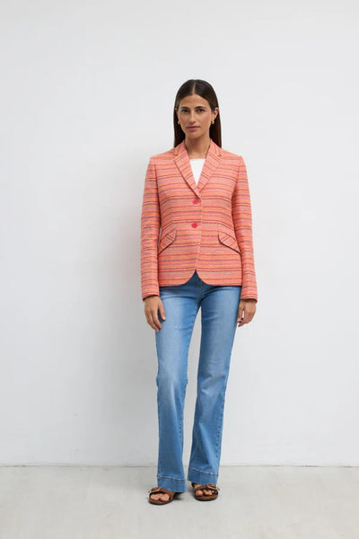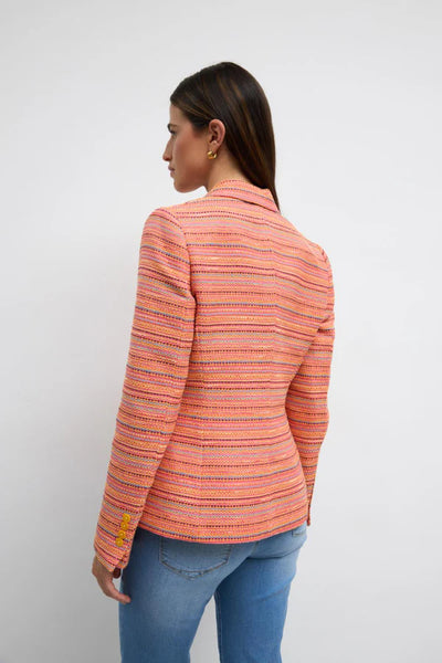 fitted multi colour tweed blazer , notched lapel . two button closure with contrasting buttons on sleeve.