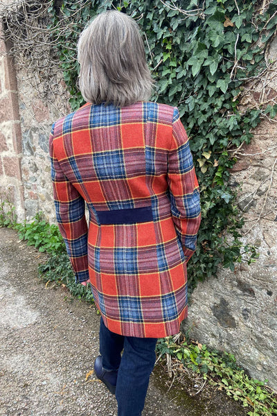 Long military-style blazer with a plaid print. Straight fit. Plain velvet mandarin collar. Front closure with embossed metal buttons. Contrasting velvet trim. Faux flap pockets with velvet trim. Long sleeves with a faux button closure and a slight slit. Velvet tab at the back. Straight hem with no vents. Lined.