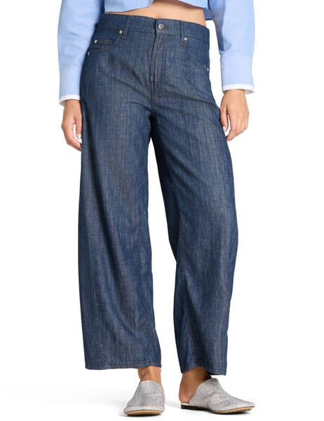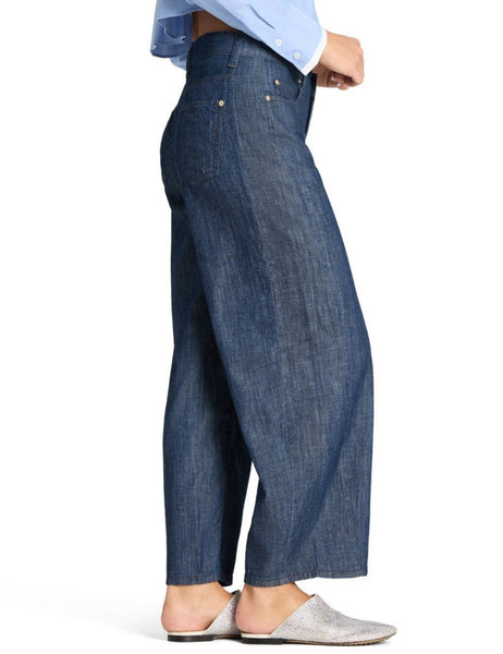 These jeans feature a modern O-shape silhouette: the rounded volume flatters the figure, while the slim, cropped leg creates the perfect balance between elegance and definition. The classic denim is given a subtle linen-like texture, offering a light, flowing feel ideal for summer.
