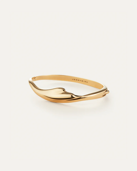 A light and lean bangle featuring a natural scalloped shell. It is water-resistant, making it the perfect gold bracelet to mix into your wrist stack. This custom bangle bracelet opens and closes with a hinge and tab lock closure. To open, push down on the highest point of the clasp before pulling the bangle open. To close, listen for a "click" to ensure tab is locked properly. Finished in high-polish 14k gold.