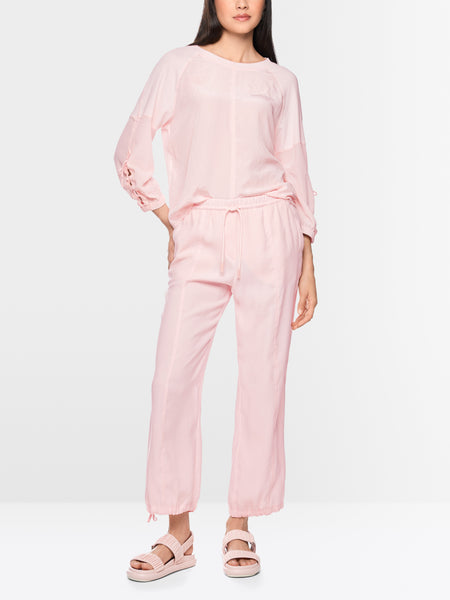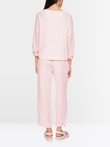 Loosely cut blouse shirt in a mix of materials. This shirt is particularly comfortable to wear thanks to its light and airy materials. The back and upper sleeves are made of cotton rib, while the front and rest of the sleeves are made of a loose-fitting fabric. The sleeves are a relaxed 3/4 length and feature side gathers and an elasticated cuff
