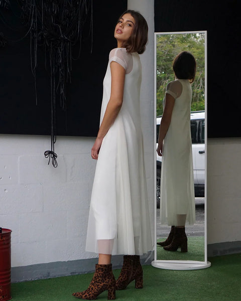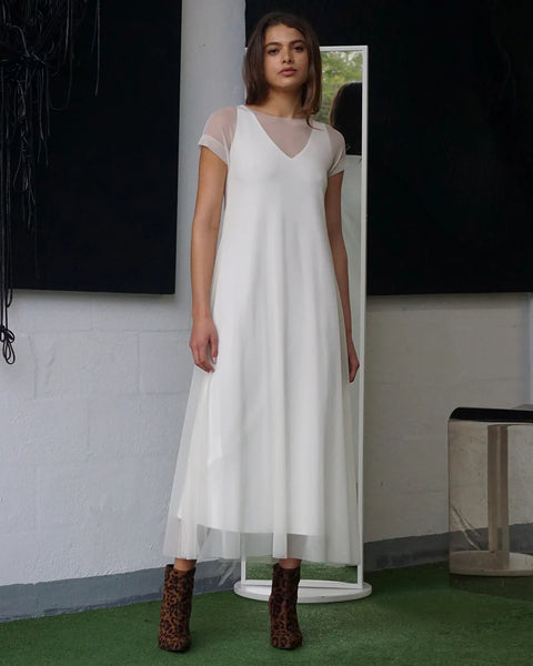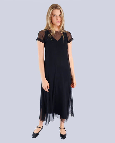 Discover the elegance of the LOZA dress, a stunning midi dress designed to make a statement at any event. Crafted from fine scuba fabric with a delicate mesh overlay, this dress effortlessly combines sophistication with modern style. The mesh dress features a boat neckline and short sleeves, adding a touch of grace. Underneath, the slip dress boasts a V-neckline and sleeveless design, providing a flattering silhouette