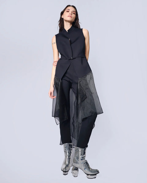 Crafted from fine scuba fabric, the ISAAC jacket elegantly pairs a longline silhouette with an asymmetrical organza skirt. A shawl collar adds a touch of sophistication, while a built-in belt cinches the waist for a flattering silhouette. The perfect piece for any wardrobe.
