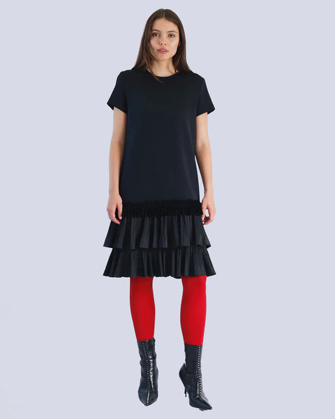 The MENZO dress redefines casual charm with bold texture. Its clean, T-shirt-style top crafted from Fine Scuba contrasts with a voluminous pleated skirt cut in Velvet and Pleated Polymat.