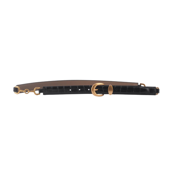 Elevate your accessory collection with our Skinny Croco Belt, featuring a luxurious crocodile-embossed texture, horse-bit hardware and polished gold keeper. Designed for style and versatility, this slim leather belt adds a sophisticated touch to dresses, blazers, trousers, and high-waisted jeans. The adjustable fit ensures comfort, while the chic gold buckle provides a timeless finish that never goes out of style.