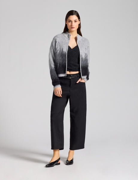 Composed of brushed kid mohair, this cardigan boasts a tricolored jacquard with a soft ombré effect. The ribbed collar adds structure, while the two-way zipper invites flexible styling. Light and warm, it blends artistry with ease.