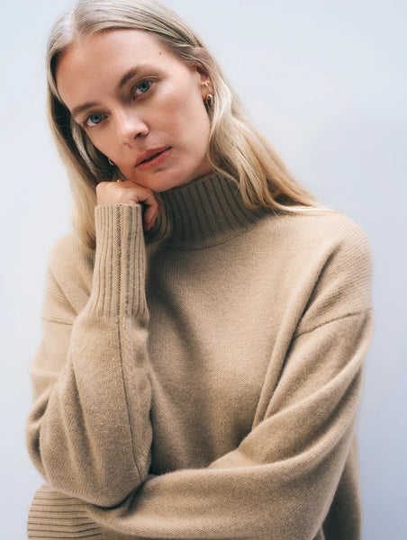 A sweater to live in. Oversized with a fluid drape, this standneck looks effortless yet feels exceptional, enveloping the body in cozy,